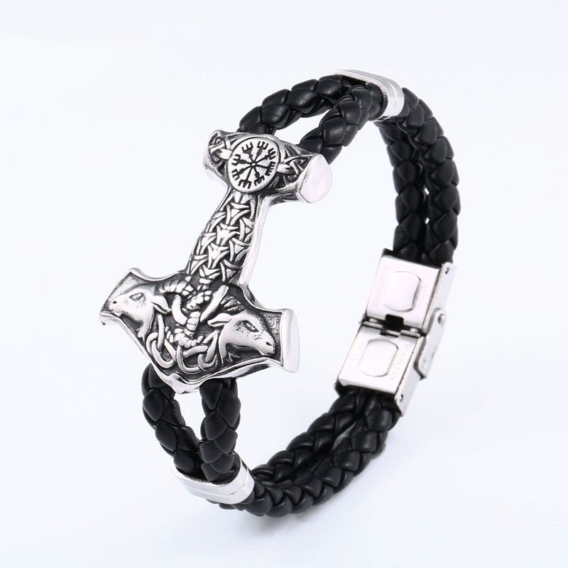 Inspired by Norse mythology, the Thundergod’s Hammerfall bracelet is a bold symbol of strength and heritage. Featuring a powerful Viking motif, this striking piece pairs a stainless steel Mjölnir hammer and goat head with rugged braided leather, creating a unique fusion of tradition and gothic edge. Durable, masculine, and meaningful, it’s a wearable tribute to the legends of old — perfect for modern-day warriors who never back down.