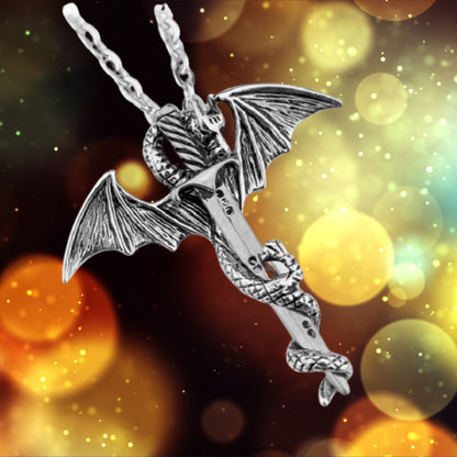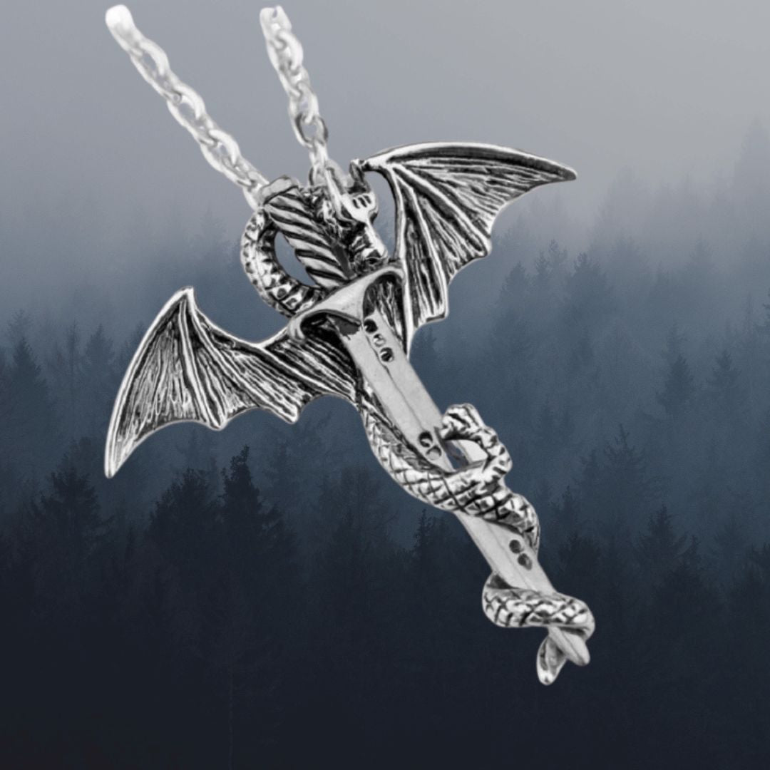 The Drake's Sword - Viking Norse Gothic Necklace by The Nevermore blends the legendary power of Norse mythology with the intricate artistry of gothic design. This striking pendant features a draconic blade-inspired design, evoking the mystique of Viking lore while offering a bold statement piece for gothic enthusiasts.