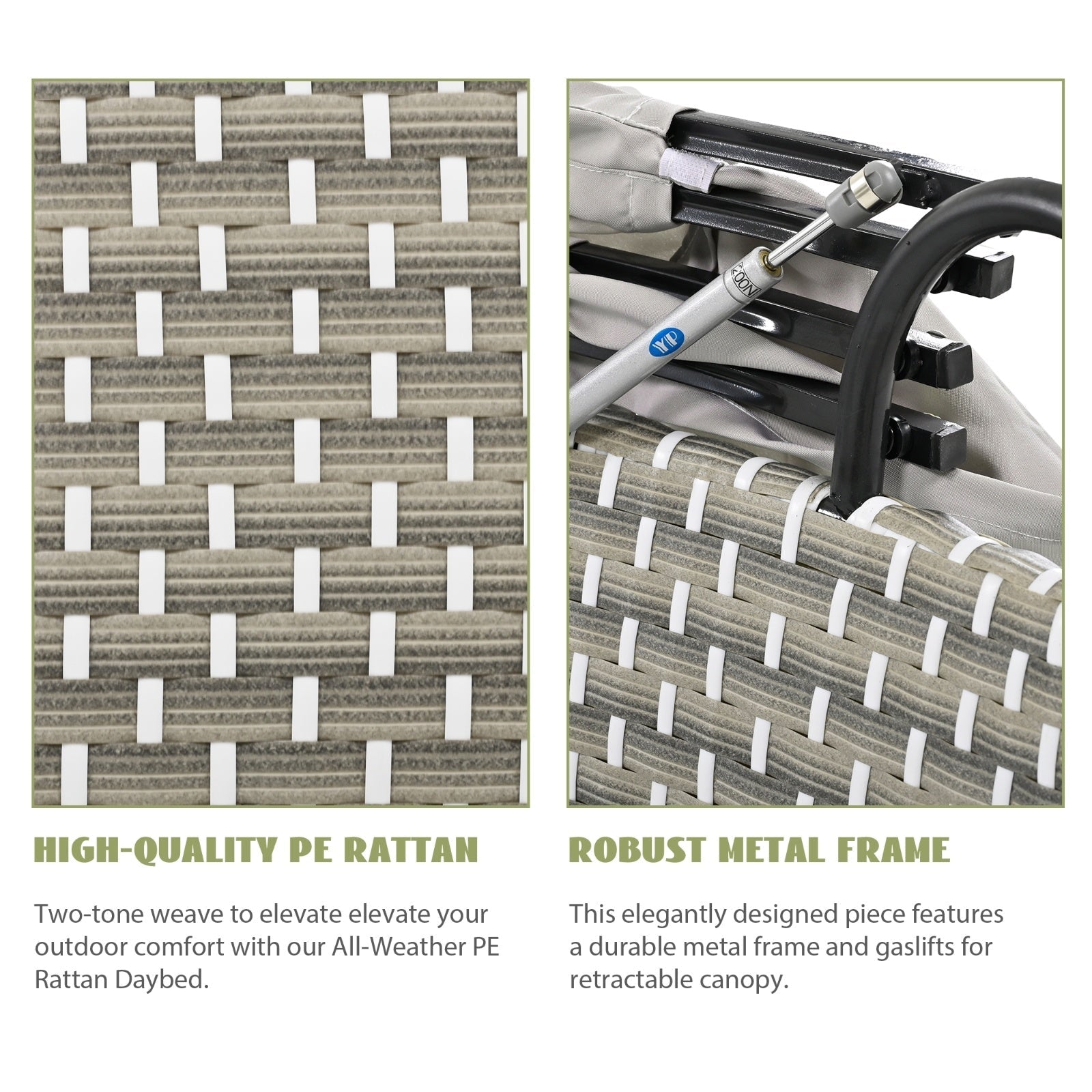 - [All-Weather Elegance & Durability] Experience year-round outdoor luxury with our beautifully crafted rattan daybed, designed to withstand all weather conditions. Made from high-quality PE rattan woven over a robust metal frame, this daybed combines elegance with resilience. The two-tone weave adds a contemporary flair, making it a stylish addition to any outdoor space. Its durability ensures that your investment remains as stunning as the day you bought it, regardless of the weather.