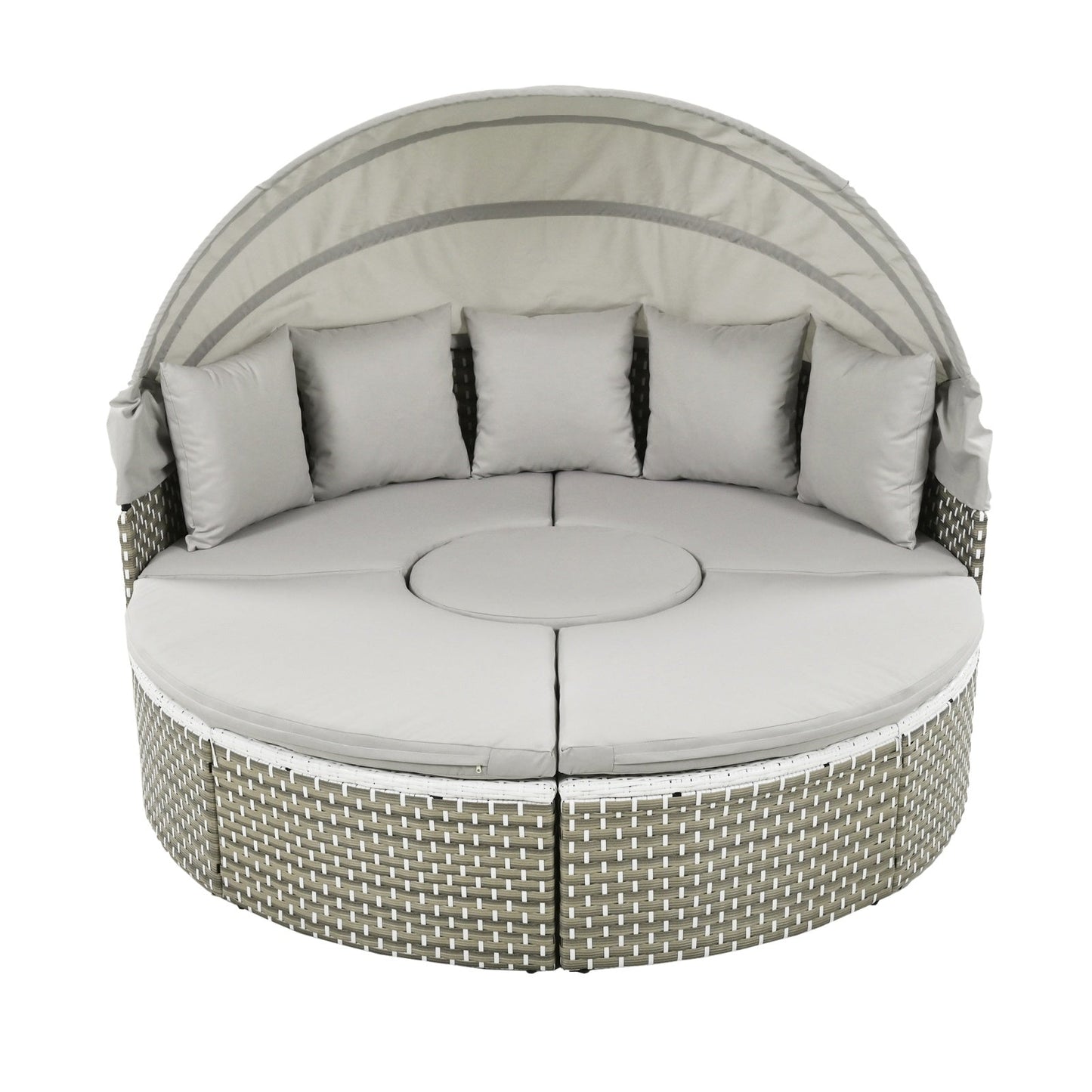 Elevate your outdoor lounging with the LuxRidge Daybed, an exquisite combination of luxury design and weather-resistant performance. Woven with two-tone PE rattan and finished in a sleek round silhouette, this sectional daybed is the perfect addition to gardens, patios, or poolside retreats. Plush gray cushions offer supreme comfort while the retractable canopy lets you relax in sun or shade. With a multifunctional center table and washable covers, this piece is as practical as it is elegant—crafted to enhance your leisure in all seasons.