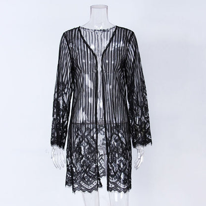Add a touch of elegance to your seaside wardrobe with the SunStrut - Lace Flower Cover-Up by The Nevermore. This exquisite beach cardigan is crafted with intricate lace flower detailing, making it the perfect accessory to showcase your style while staying cool and comfortable.